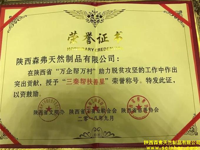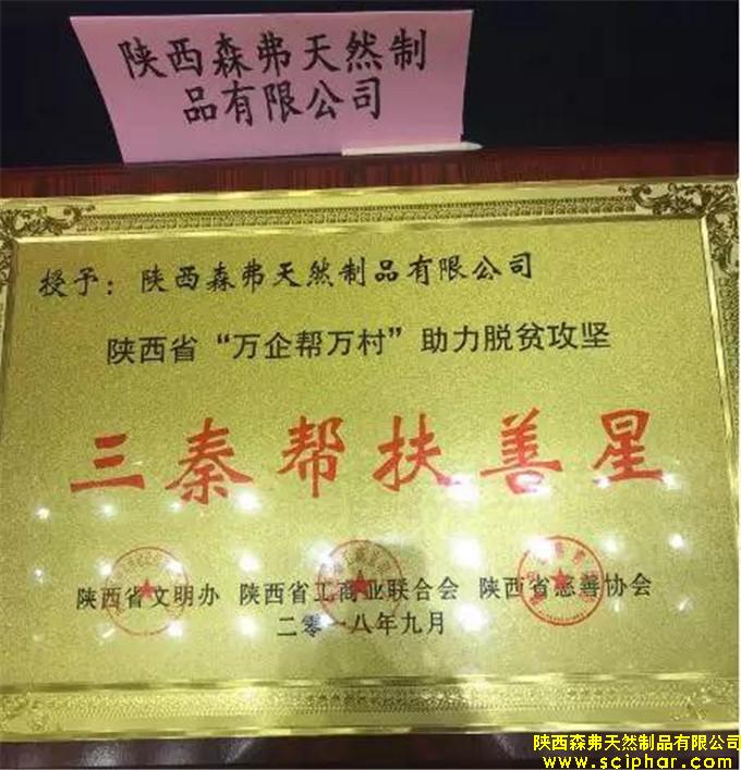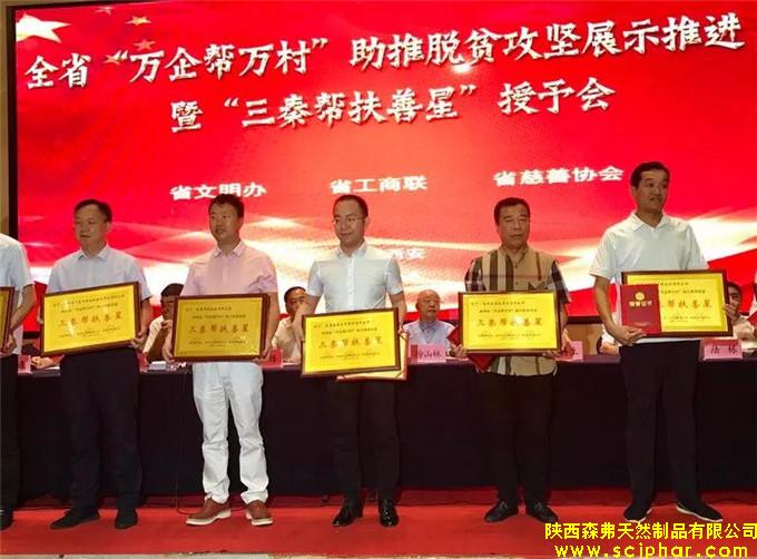 9月4日,陜西省“萬企幫萬村”助力脫貧攻堅(jiān)推進(jìn)暨“三秦幫扶善星”授予會在西安舉行。省委常委、省委統(tǒng)戰(zhàn)部部長姜鋒,省決策咨詢委員會主任徐山林,省慈善協(xié)會會長劉維隆,以及吳前進(jìn)、陳再生、鮑貽勇、陸棟、李榮杰、徐明非、彭安季等領(lǐng)導(dǎo)出席。陜西森弗天然制品有限公司被授予“三秦幫扶善星”榮譽(yù)稱號。