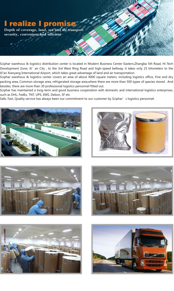 1, los ingredientes naturales más seguros y soluciones proporcionadas. 2, cultivar y seleccionar las materias primas más naturales y nutricionales. 3, 27 empleadores de investigación y 4 sitios de fabricación. 4, el sistema de gestión de calidad GMP a lo largo de todo el proceso de producción. 5, Producir de forma flexible de acuerdo con la orden a granel o un peque?o lote. 6, la respuesta más rápida y la entrega más rápida. 7, nuestros productos se venden a 96500 clientes y a más de 120 países. 8, el servicio profesional con entusiasmo y vigorosidad del grupo de Sciphar . |